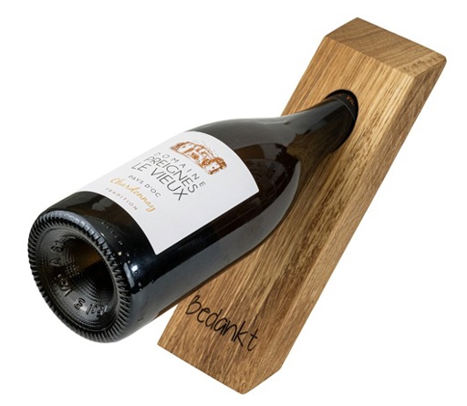 Mooie eikenhouten wijnfleshouder met innovatief design waardoor de fles als het ware zweeft. In het massief eikenhout is de tekst 'Bedankt' gegraveerd. Ideaal als geschenk of bedankje.