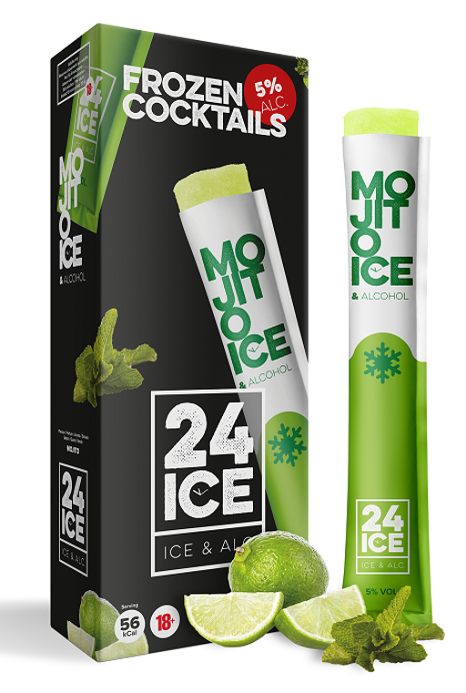 In samenwerking met De Kuyper Royal Distillers heeft 24 ICE frozen cocktails ontwikkeld in de smaken Mojito, Strawberry Daiquiri, Limoncello, Pina Colada en Vodka Energy. De cocktail ijsjes van 24 ICE bevatten 5% alcohol en slechts 53 calorieën! Deze unieke combinatie zorgt voor een verfrissende en coole beleving, elke keer opnieuw!