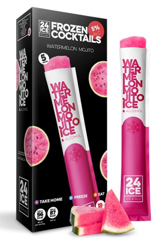 In samenwerking met De Kuyper Royal Distillers heeft 24 ICE frozen cocktails ontwikkeld in de smaken Mojito, Strawberry Daiquiri, Limoncello, Pina Colada en Vodka Energy. De cocktail ijsjes van 24 ICE bevatten 5% alcohol en slechts 53 calorieën! Deze unieke combinatie zorgt voor een verfrissende en coole beleving, elke keer opnieuw!
