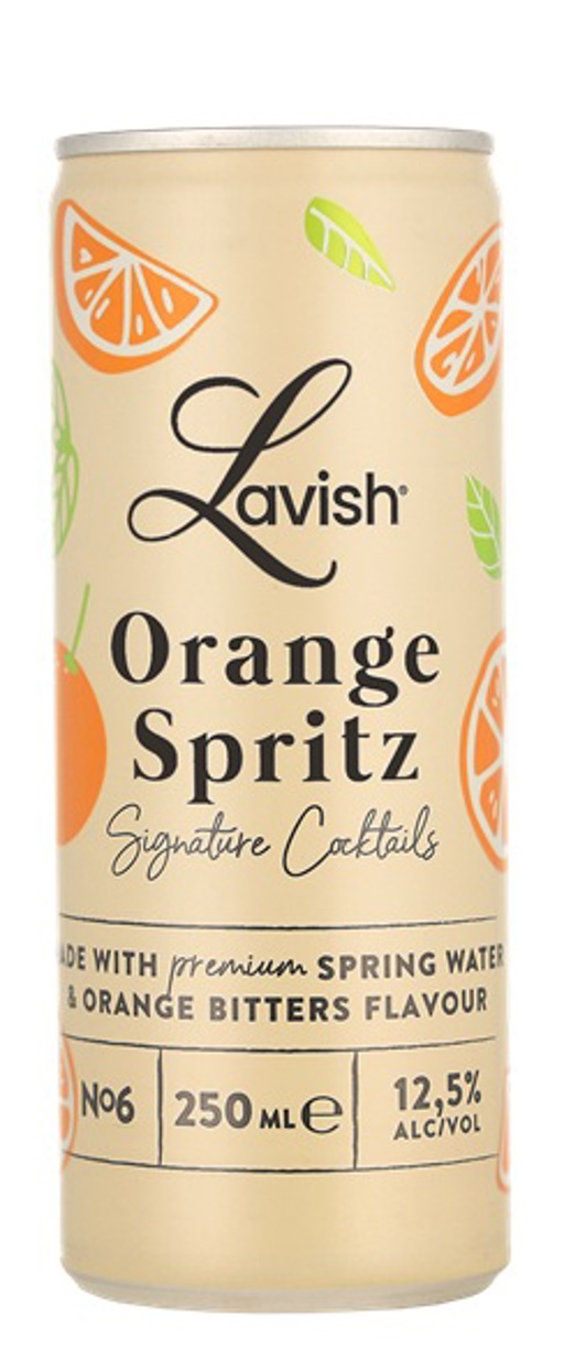 Lavish Orange Spritz is een sprankelende ready-to-drink cocktail met een verfrissende sinaasappelsmaak en een vleugje bitterheid, geïnspireerd op de klassieke Italiaanse Spritz.