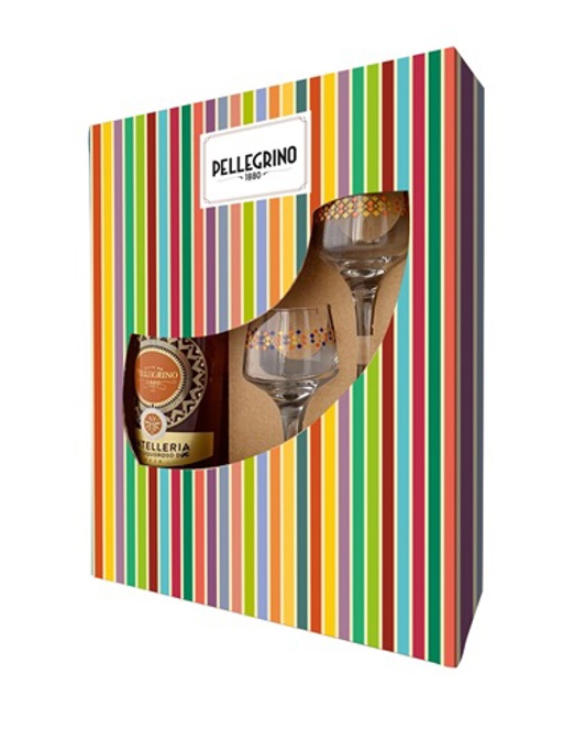 In deze mooie geschenkverpakking zitten twee leuke glaasjes met daarnaast een fles Pellegrino Passito di Pantalerria (50cl)
