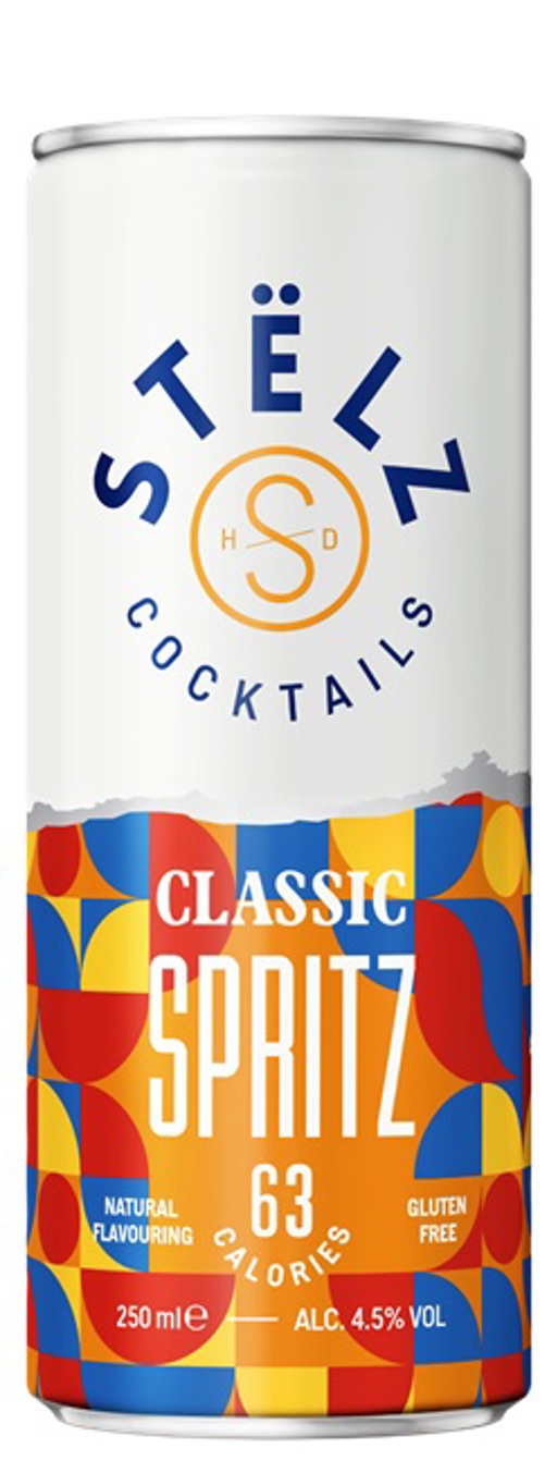 STËLZ Cocktails Classic Spritz bestaat uit bruiswater met sinaasappelbitter-smaak en 4,5% alcohol. Geen suiker, geen koolhydraten, geen gluten en slechts 63 calorieën per 25cl blikje.