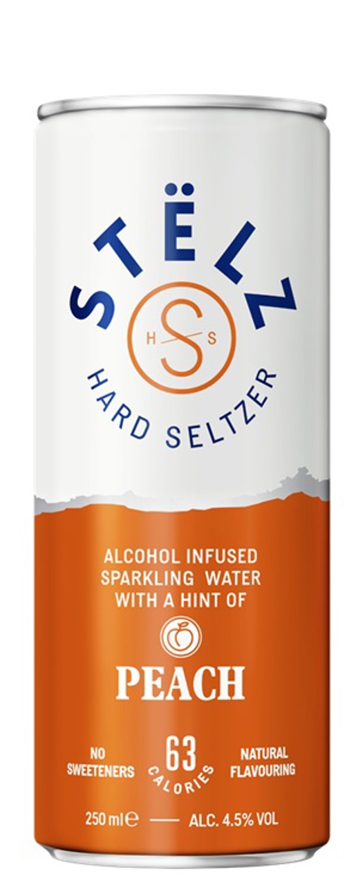 STËLZ Hard Seltzer Peach bestaat uit bruiswater, een vleugje perzik en 4,5% alcohol. Geen suiker, geen koolhydraten, geen gluten en slechts 63 calorieën per 25cl blikje.