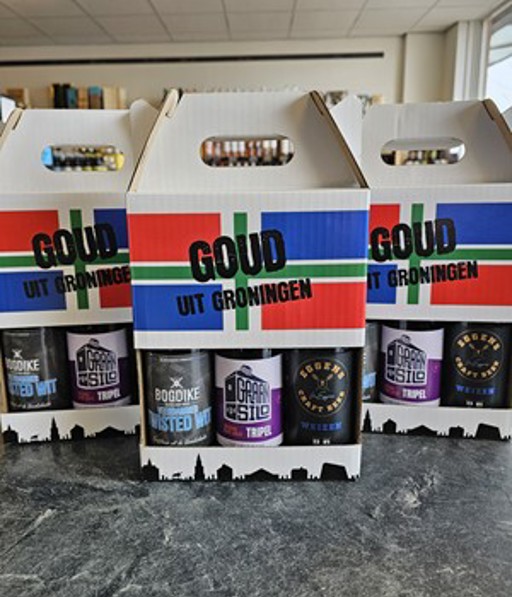 Bij ons in de winkel kunt u verschillende lokale geschenkverpakkingen vinden, waaronder Goud uit Groningen. Goud uit Groningen bevat 3 verschillende bieren uit de provincie. De samenstelling van dit pakket wijzigt per levering en zal dus niet altijd gelijk zijn aan de getoonde foto.